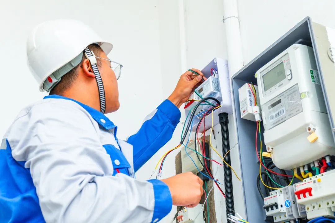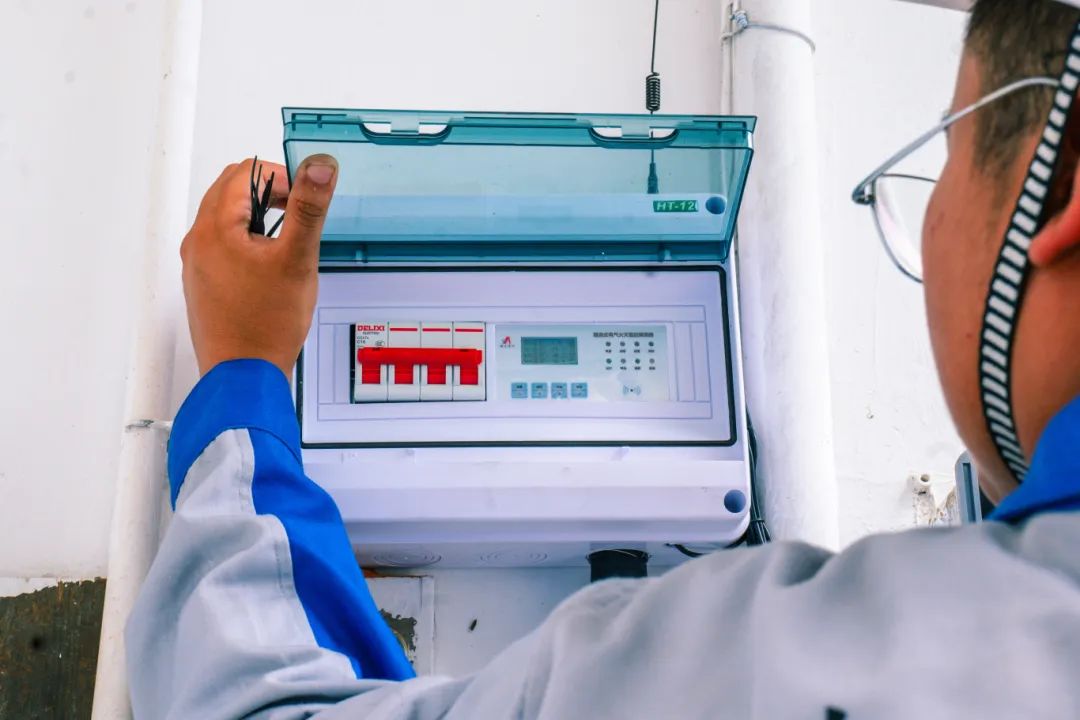 施工人員正在安裝家用型電氣火災監(jiān)控探測器