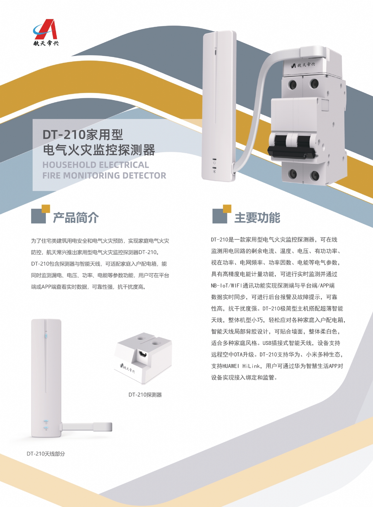 DT-210極簡型主機搭配超薄智能天線,整體機型小巧,輕松應對各種家庭入戶配電箱,智能天線局部背膠設計,可貼合墻面,整體柔白色,適合多種家庭風格。USB插接式智能天線,設備支持遠程空中OTA升級。DT-210支持HUAWEI HiLink,用戶可通過華為智慧生活APP對設備實現接入綁定和監管。