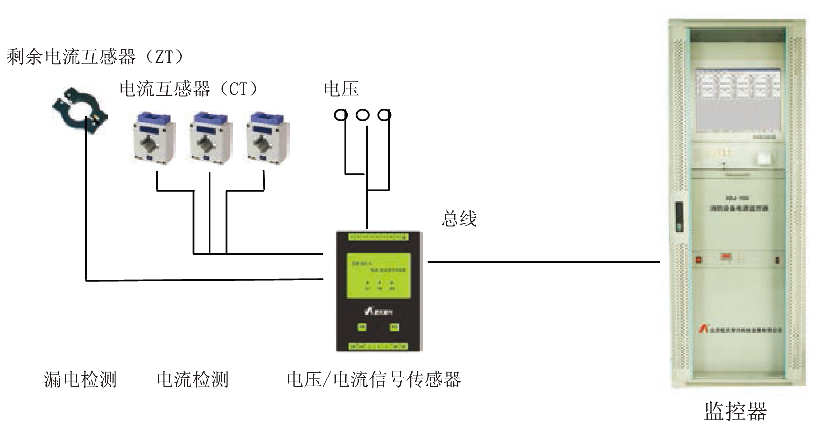 消防設(shè)備電源電壓/電流信號傳感器采用剩余電流互感器(ZT)監(jiān)測配電線路的漏電電流,采用電流互感器(CT)監(jiān)測線路中的過線負載電流,同時也監(jiān)測電路的三項電壓值。傳感器檢測的信息經(jīng)總線傳輸至監(jiān)控器,監(jiān)控器實時接收各傳感器發(fā)送的各種信息,并在監(jiān)控器屏幕上實時顯示,監(jiān)控器具有聲光報警、數(shù)字顯示、數(shù)據(jù)存儲、查詢、打印輸出、報警信號輸出等功能。
