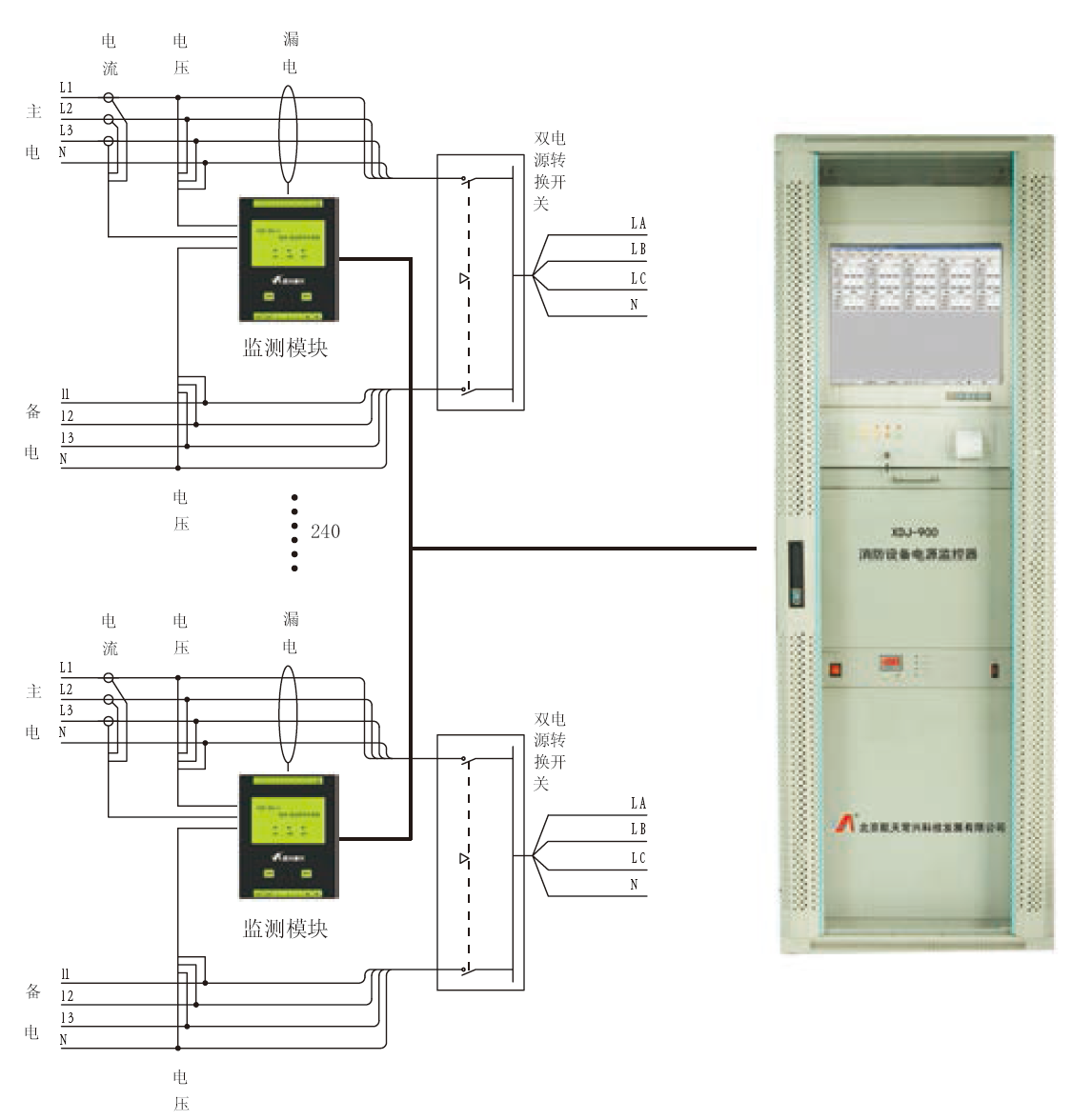 XDM-300/AC監(jiān)測模塊與XDJ-900監(jiān)控器連接使用來構(gòu)成消防設(shè)備電源監(jiān)控系統(tǒng)